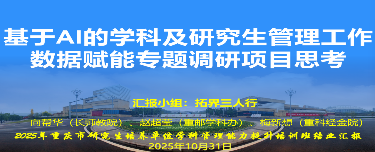 培训期间,我校三位学员聚焦学科发展核心需求,围绕政策把握、规划制定、评估实施与服务优化等关键维度,积极与授课专家深入探讨,与兄弟院校同行充分交流。其中,向帮华教授担任培训班学习小组组长,并在结业环节作了题为《基于AI的学科及研究生管理工作数据赋能专题调研项目思考》的汇报发言,其扎实的研究内容和突出的表现获得了重庆市教委研究生处、承训单位的高度评价,也赢得了全体学员的广泛认可。